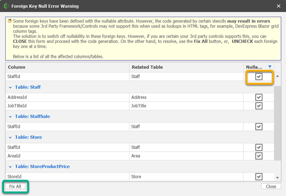 - Fix All: This will automatically fix all the tables whose foreign key is nullable with a single click.