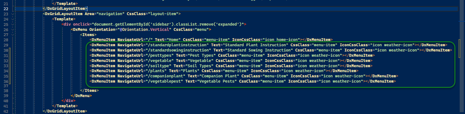 This preview is for a menu used in a DevExpress Blazor App. It shows the generated code. - Format - This button allows you to format the way the menu will look. See Setup Menu Format