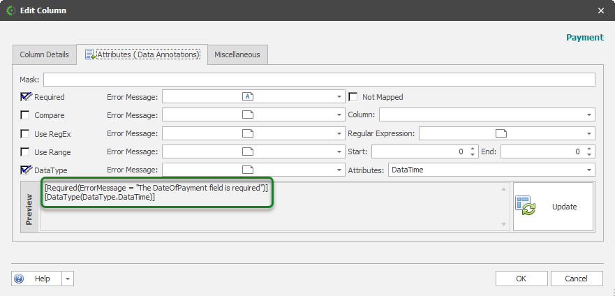 Now, assuming we have updated the DateOfPayment column in the Payment table to have the following attributes: