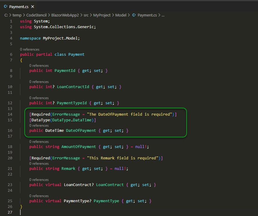 After the node - (3) Trigger Attribute Update has been executed, we will see that Payment.cs is now updated with the attributes: