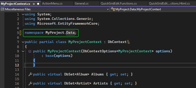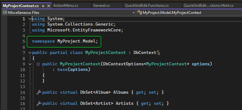 In this next scenario, the EF Scaffolder generated the DbContext Class - MyProjectContext.cs with the same namespace for the model classes.