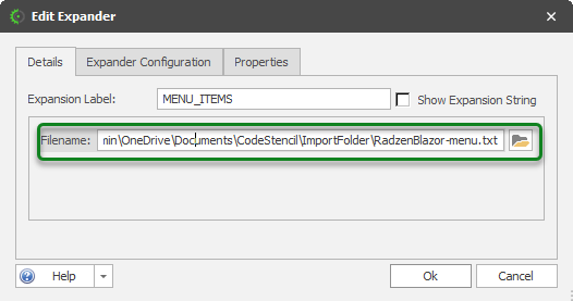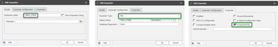 - Create an expander - The expander type should be FILE; check the "Is Imported File" property. We will call our expander MENU_ITEMS.