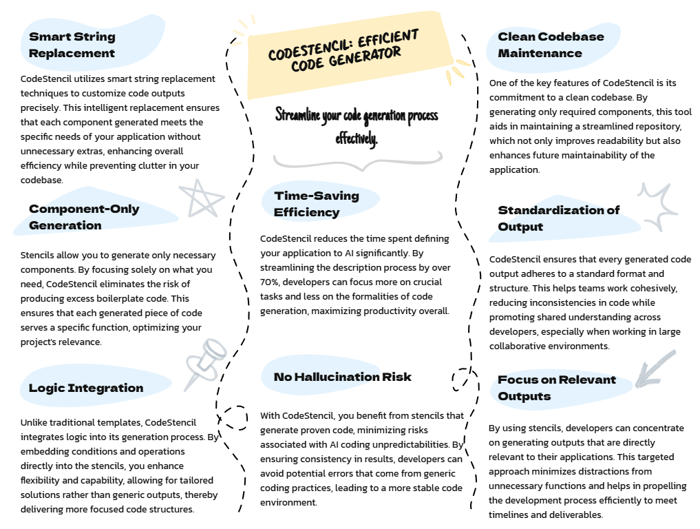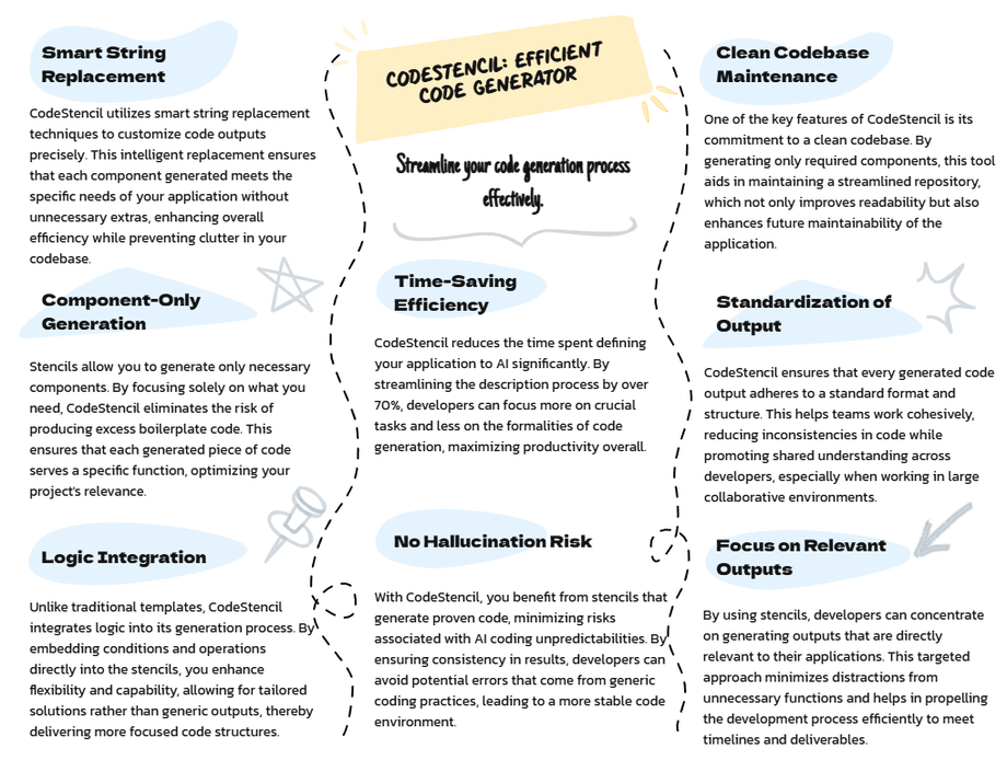 CodeStencil also cuts down the time spent describing your application to AI by over 70%, saving you tokens. Since stencils generate proven code, there is no risk of hallucination common with vibe coding; you get the same reliable result every time. This combination of precision, efficiency, and reliability makes CodeStencil an ideal tool for streamlined and consistent code generation.