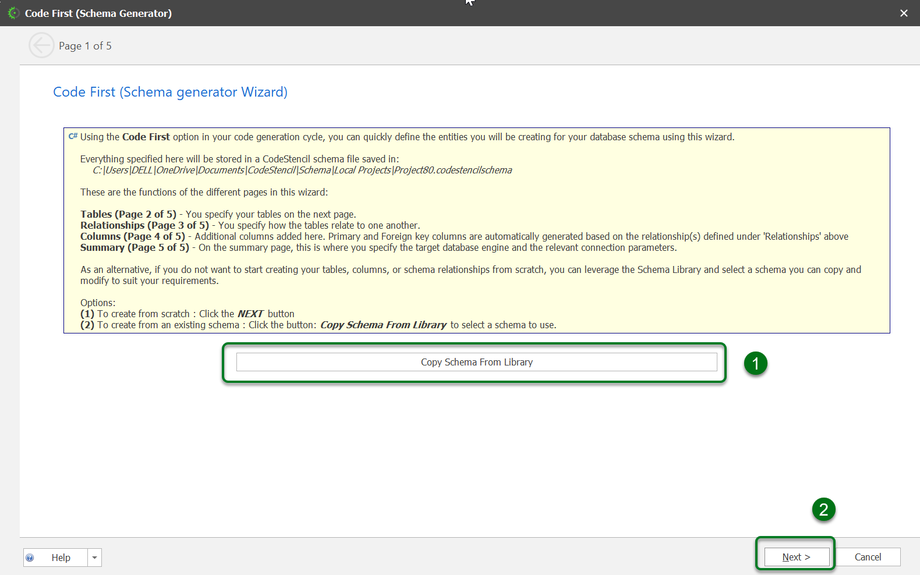 - Option 1: This will copy the schema from the list of schema libraries. This will set up the tables, columns, and relationships for you with little to no change.