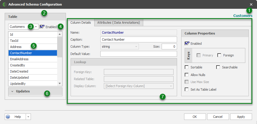 The Advanced Configuration interface allows you to update Tables and columns at the same time.
