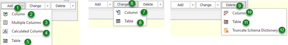 Different buttons can be used to update the Schema Dictionary and have further actions that you can leverage when you press the dropdown.