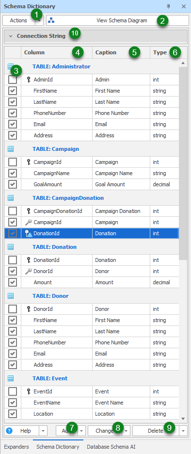 - Collapse All - This collapses the contents of the Schema Dictionary so that only the tables names are shown.