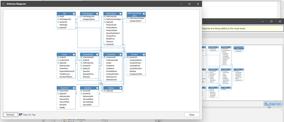 Further to the right, you see the graphical representation of the schema. If you want to zoom in, you can click the "Image Zoom" button: