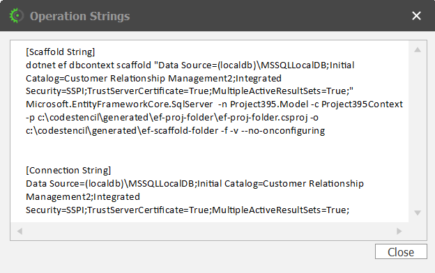 Operation Strings - This option is used to check for the Scaffold String and Connection String. The image below shows what you will see when you click that button. This becomes helpful when you are trying to debug database import issues.