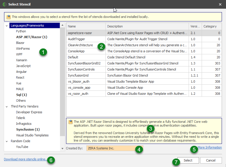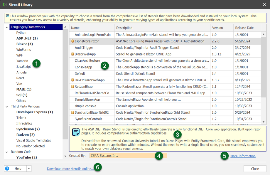aspnetcore-razor, clickingMore Informationwill redirect you to a page containing detailed information about theaspnetcore-razorstencil. - Download more stencils - This link allows you to download stencils from the online marketplace.
