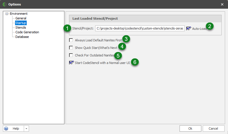 Auto Load - When checked, the project/stencil automatically loads in (1) when CodeStencil starts.