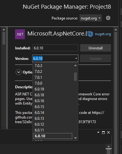 DOTNET_VERSION. You can modify the version by double-clicking on the field. Also, ensure that you have the same Entity Framework version installed in your Visual Studio. You can accomplish this by navigating to your NuGet Package and searching for Microsoft.AspNetCore.Diagnostics.EntityFrameworkCore. Your search result should resemble the image below: